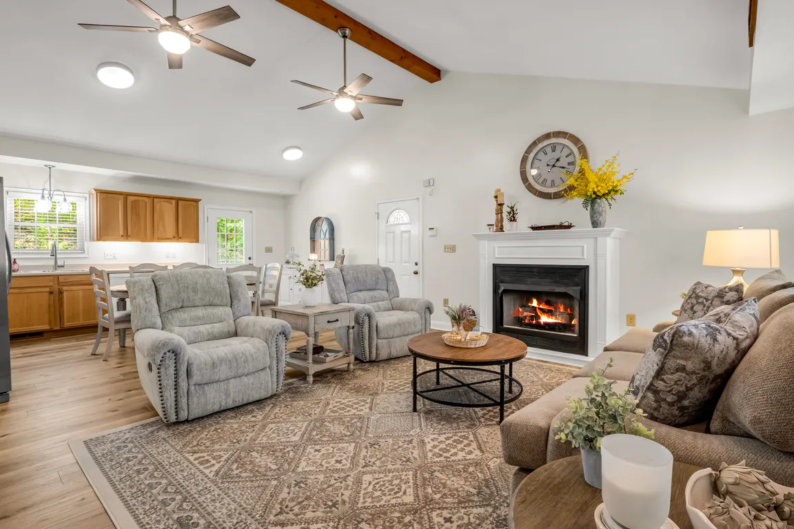 Front porchCozy fireplaceAbundant natural lightSpacious garageSoaring vaulted ceilingsTray ceilingExceptional privacy