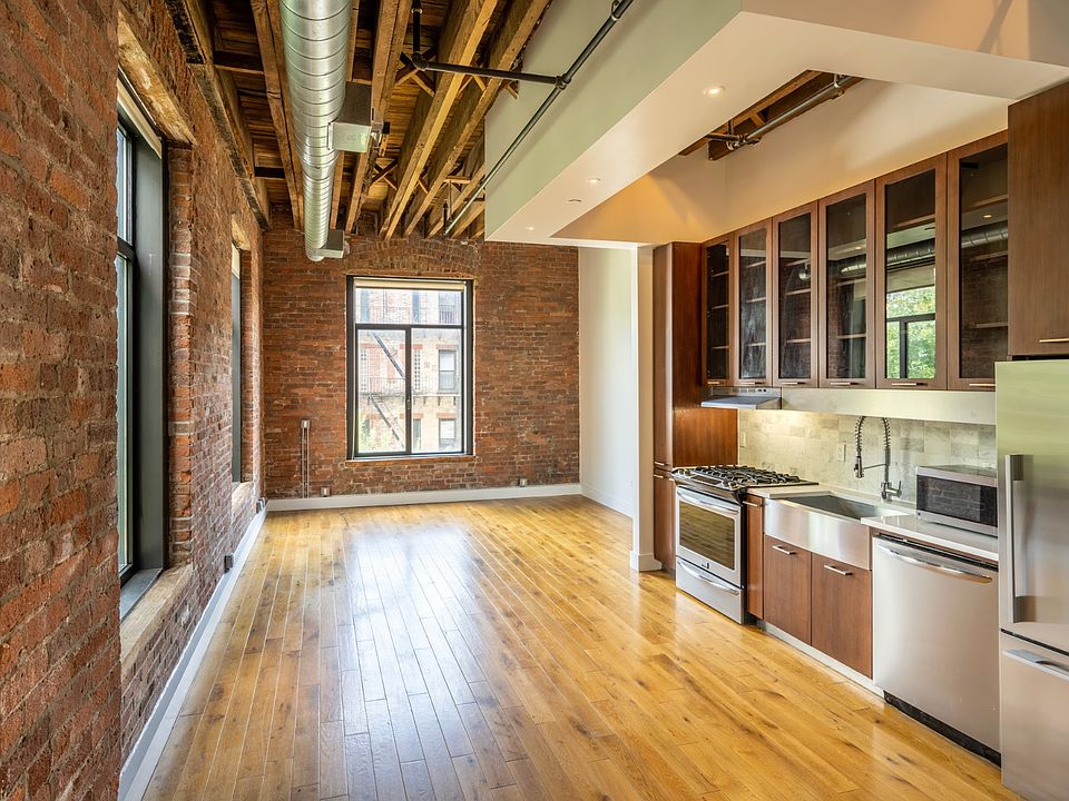 Oversized windowsExposed brick wallsTons of natural lightIndustrial charmWide plank hardwood flooringStainless steel appliancesOpen concept kitchen