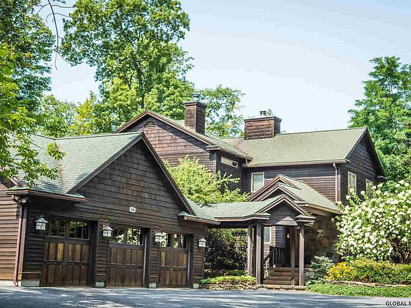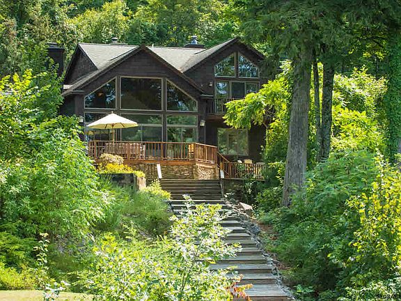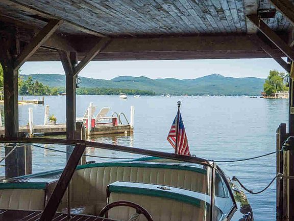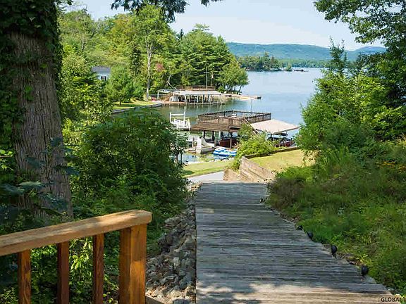 FOUR DOCK SPACES! - This beautiful authentic Adirondack Style home boasts an open glass wall to the beautiful western exposure views of Lake George and incredible sunsets. Cedar wood siding and stonework with 3,396 sq. ft. of living space featuring 3 bedrooms, 3 full baths and 3 car garage w/covered walkway. Great Room with stone fireplace, family room, sitting area with wood burning stove, formal dining area, sauna and tanning booth. 900 feet of lakefront, decks, balconies, and E shaped sundeck covered crib dock and pier. Golf cart access to water by driveway or use shallow steps.