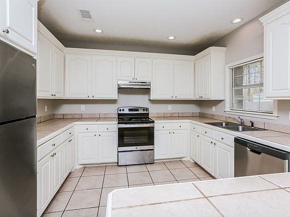 The spacious eat-in kitchen features sleek tile flooring, stainless steel appliances, and a central island designed for both meal prep and entertaining. Each bedroom continues the clean, modern look with LVP flooring, ceiling fans, and generous closet space to keep everything organized.