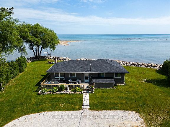 A Rare Waterfront Gem on Georgian Bay. Welcome to 139 Teskey Drive - a truly special property nestled along 145 feet of pristine waterfront on the crystal-clear shores of Georgian Bay. This charming 4-season cottage captures the essence of lakeside living, offering breathtaking sunrise and sunset views. Tucked in the heart of The Blue Mountains, this property boasts uninterrupted panoramic vistas of the bay, the ski slopes of Georgian Peaks, and the surrounding natural beauty. Step inside the original cottage and you'll find a warm, inviting space that's been thoughtfully updated while retaining its cozy character - the perfect place to unwind after a day on the water or slopes. Take advantage of the existing cottage or envision and build your own custom waterfront retreat on this expansive, private lot framed by the natural beauty of Georgian Bay. Whether you're enjoying your morning coffee on the deck, launching a kayak from your own shoreline, or gathering around the fire with friends, this property offers endless opportunities for relaxation and adventure. Located just a short drive to the exclusive Georgian Bay Club, Georgian Peaks, and mere minutes from the vibrant shops, restaurants, and amenities of Thornbury, this is your chance to own a slice of paradise in one of Ontario's most coveted waterfront communities. Multiple undertakings and improvements of the property since purchase in 2019. Survey (2019), topographical plan (2019), shoreline hazard assessment (2022), rebuild of breakwall and addition of armour stone steps to beach (2022), new shingles (2022), deck on waterside (2025), removal of multiple trees, leveling, and sod added, regrading and widening of driveway and parking area. Interior upgrades: paint throughout, addition of luxury vinyl plank flooring, upgraded kitchen cabinets, newer light fixtures, addition of laundry. Set of building plans for 5000 square foot home, pool, and double car garage available, as well. Be sure to check out the video!