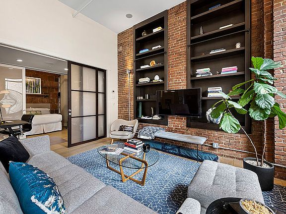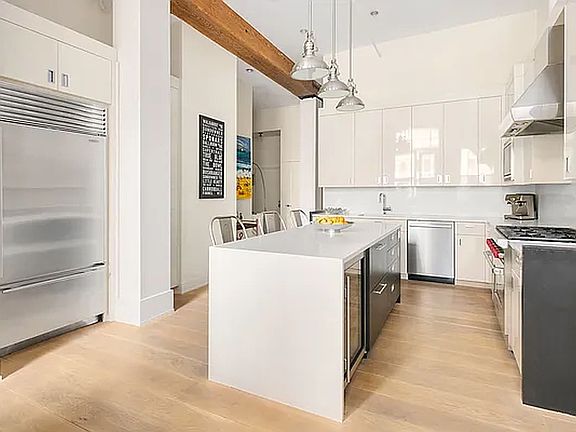Welcome to a truly unique and sleek loft in Chelsea, located in a converted manufacturing warehouse that seamlessly blends modern convenience with preserved pre war characteristics. As you step into the entryway of this remarkable home, your eyes will be drawn to the oversized windows that provide open lovely views of a local park and blooming Spring trees, and the 12-foot ceilings that create a sense of grandeur. This fabulous loft features two bedrooms, a den and two bathrooms, boasting 7-inch-wide oak plank floors, exposed brick, wood beams, custom lighting, abundance of closets, and built-in speakers and shelving. The loft is also equipped with Mitsubishi split system central air for ultimate comfort and a vented Frigidaire oversized washer and dryer housed in its own laundry room. The expansive living and dining areas are perfect for entertaining, featuring exposed brick, architectural detailing, and plenty of space for hosting guests. The state-of-the-art kitchen is a chef's dream featuring top-of-the-line appliances such as Sub Zero refrigerator, Wolf 6-burner stove with vented hood, Bosch dishwasher, a large Sub Zero wine fridge, and a freezer drawer. The kitchen island is not only functional for food prep, but also serves as a gathering spot for guests during dinner parties.