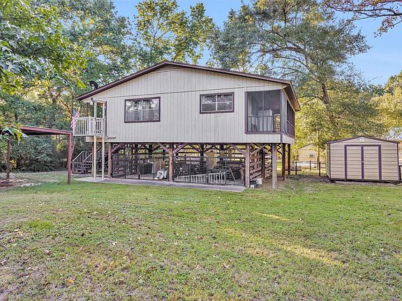 Check out this one of a kind home in the Lakewood community, located on Lake Livingston. This 3 bedroom, 2 bathroom home sits on stilts and has never been flooded. The first level offers so much potential and is equipped with power and closed in with fencing. There is a cargo lift/elevator or stairs that can take you to the main home level. You are welcomed with a large covered patio in the front and another covered and screened in patio in the back that is tranquil and perfect for relaxing. Inside, the open concept floor plan makes for easy living. The primary bedroom offers an en-suite bathroom. All rooms are spacious with newly installed carpet. Updates include Generac Generator, PEX waterline, new ductwork, on demand tankless water heater, metal fencing. The storage building sits on a 12x16 slab and provides extra storage. Washer, dryer, refrigerator stay. Community offers gated entry, boat ramp, and picnic area. Come see what Lakewood has to offer! Low taxes!