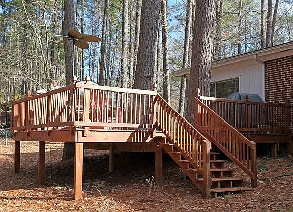 Very comfortable home, with separate living room, dining room, and family room, in addition to three bedrooms and two updated bathrooms. Large deck out back large fenced-in backyard. Backs onto acres of green space with running trails. Near bus line to UNC campus & minutes to the heart of Franklin St. Google Fiber available. Quiet neighborhood with active and supportive listserv and neighborhood events. Hardwoods in living, dining, 3 bedrooms. Tile bathrooms. Separate living room and dining room. Kitchen with cork flooring, open cabinets, pantry. Step down to family room: carpet, brick accent wall, ceiling fan, exit to deck. Master bedroom with en suite bath with tile shower, wainscoting. 2nd bath with tub-shower. Raised deck, fenced backyard, attached shed. Driveway parking. Pet w/fee, prior approval. $15/mo filter fee. Unfurnished. Renter is responsible for utilities, internet, and yard. No smoking allowed. Pets permitted.