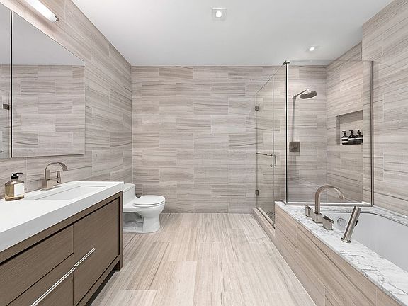 The serene primary suite features custom closets and a spa-caliber bath with wood-grey marble, double vanity, deep soaking tub, and radiant-heated glass-enclosed shower. The second bedroom has been fully renovated with custom millwork and tailored storage, supported by a beautifully updated secondary full bath.