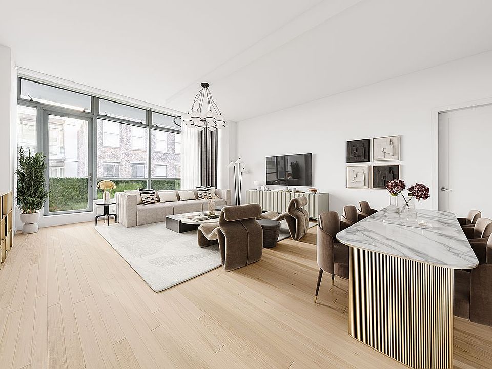 A proper entry introduces a sun-filled great room with 11' ceilings, newly refinished wide-plank flooring, and custom lighting throughout. Floor-to-ceiling windows frame the treetops along Wooster Street while new electronic solar and blackout shades and an integrated whole-home sound system provide seamless modern comfort.