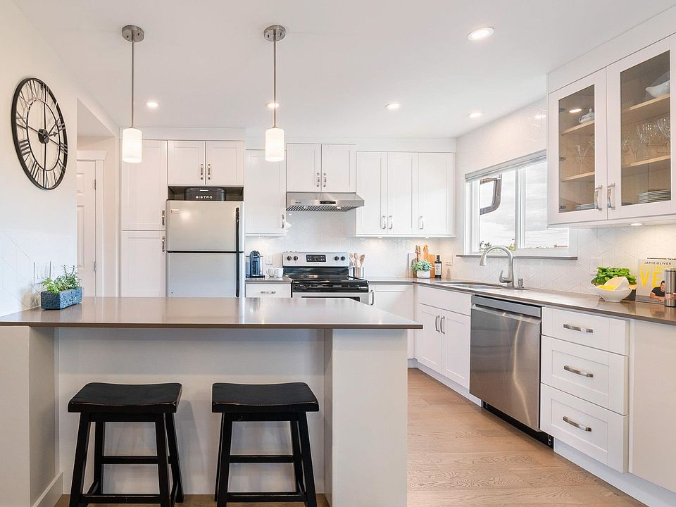 Stunning and spacious TOP FLOOR CORNER unit in sunny White Rock, this 2 BR, 2 BATH home shows as a "perfect 10". Fully renovated in 2020 ($90k), it features a desirable 1000+ sq ft layout with large entryway, extra storage and lots of light. Kitchen w/ counter bar opens to dining/living area with a charming gas fireplace. Updates: engineered hardwood floors, kitchen, bathrooms, blinds, lighting, ceiling, doors, trim & more! Primary bedroom easily fits king bed, has walk thru closet & 3-piece ensuite with large shower. In-suite laundry. Solarium to enjoy all year round. Well managed strata, roof (2021), newer windows. Heat & hot water included in monthly fee. Excellent walkable neighbourhood close to shops, dining, transit, beach & the WR Pier! All ages welcome, 2 pets (cats/dogs) allowed.