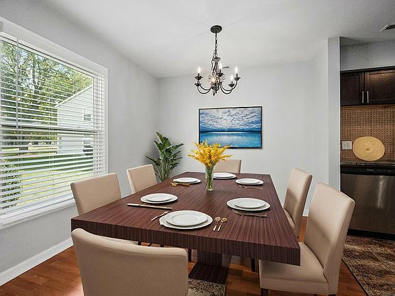 Recently updated bathroom vanityDedicated dining areaSleek cabinetsGrassy courtyard areaGranite countertopsStainless steel appliancesTile backsplash