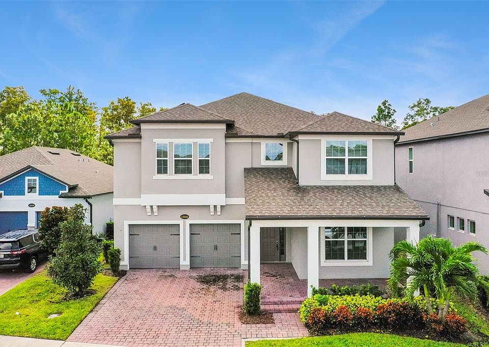 Welcome to this nearly new and lovely 5-bedroom, 4-bath home in the sought-after community of Encore at Ovation in the heart of Winter Garden/Horizon West. TWO PRIMARY BEDROOMS make it a rare opportunity to have a dual primary bedroom home! One of the neighborhood’s most popular floor plans, this home impresses with its smart layout and thoughtful design to suit any family. From the beautiful entryway and tall ceilings to the open, spacious kitchen, every detail feels elevated. The gourmet kitchen features dark-toned cabinetry, granite countertops, and a stunning textured backsplash that extends to the ceiling behind the stainless vent hood—adding both depth and flair. A cozy breakfast nook sits just off the kitchen, with additional seating at the oversized island, perfect for casual meals or entertaining. The large family room showcases expansive windows framing a private view—no rear neighbors and an exceptionally deep lot backing to serene natural scenery, a rare find in this area. Step outside to the covered lanai, perfect for relaxing or dining al fresco while enjoying the peaceful backdrop. This floorplan offers a first-floor bedroom (or office), a full bath and a separate exterior door offers ideal flexibility and easy outdoor access, great for a future pool or backyard oasis. Upstairs, enjoy a spacious bonus room with LVP flooring, additional guest or secondary bedrooms, and a huge primary suite with stylish, upgraded finishes throughout. The home is just a few houses away from a playground and green space, and residents also enjoy fantastic community amenities including a pool, fitness center, dog park, and more. Best of all, you’re only 3 miles from Flamingo Crossings—a vibrant retail and dining destination—and less than 5 minutes from the iconic Disney World arch. Experience modern living, beautiful design, and an unbeatable location all in one!