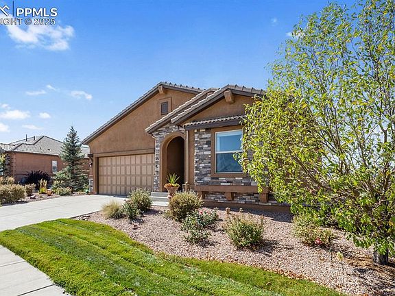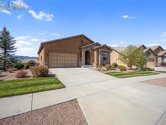 This bright and open ranch-style home in the desirable Flying Horse neighborhood offers stunning mountain views and access to award-winning Academy District 20 schools. Enjoy an ideal location with easy access to downtown Colorado Springs, the Air Force Academy, and major routes via I-25 and Highway 83. Inside, the renovated kitchen features granite countertops and wired under-cabinet lighting, flowing seamlessly into open living and dining areas with real hardwood floors. The primary suite is a serene retreat with a large picture window and updated bath featuring a tiled walk-in shower and barn door for privacy. Main-floor living continues with two additional bedrooms, main floor laundry, and an updated bathroom, making everyday life effortless. The finished walkout basement adds bright, versatile space with a spacious family room, built-ins for TV equipment (pre-wired for 7.2 sound system), and a flex room with double barn doors. Two more bedrooms with generous closets, a bathroom with double split vanities, and built-in shelving complete the lower level. Garden-level windows bring in natural light, while plantation shutters add style and comfort. Ample storage includes a large unfinished area with workbench cabinet. Step outside to take in Pikes Peak views and Thunderbird flyovers from the Trex deck with a remote-operated screen, or enjoy the walkout patio that extends to the backyard green space. Outdoor yard maintenance, snow, and trash removal are all handled by the HOA, making both front and back yards easy to enjoy. Every detail has been designed for comfort and convenience—from front stone accents and new carpet with extra padding, to custom tri-light blinds and double access utility doors. Whether it’s cozy evenings by the fireplace, sunny afternoons on the deck, or family gatherings in the basement, this home invites you to live fully and comfortably. It’s more than a house—it’s the perfect backdrop for your everyday story.