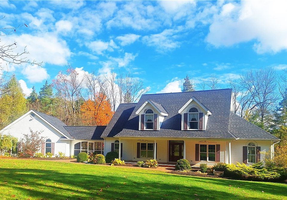 Welcome to seclusion! Follow the winding drive to this 5381 Sq.Ft. Custom built home on 5.5 acres overlooking picturesque 1 acre stocked lake. Features 5 Bedrooms and 5 baths with 1st floor Primary Suite with gas fireplace overlooking lake. Grand Entry foyer with Maple hardwood floors throughout, vaulted ceilings, granite counters, Formal dining, Library, breakfast room. Walk out family room in lower level. NEW ROOF 10/2025! Rear deck and screened covered patio to sit and enjoy the tranquil water feature and serene lake. Truly a must see!