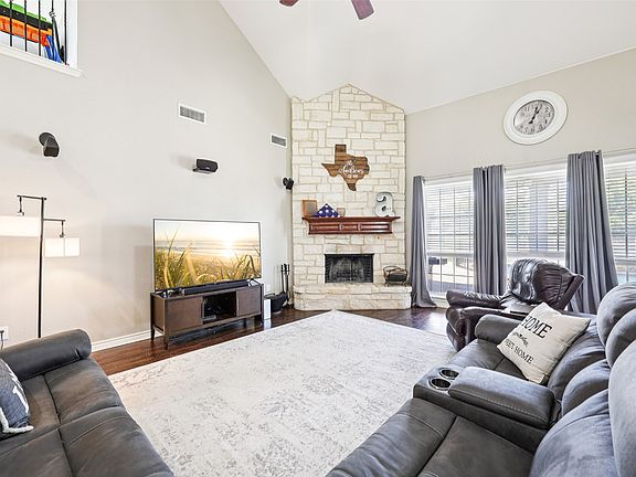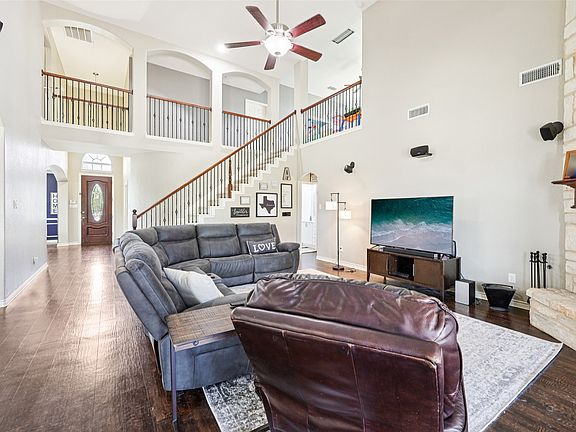 Stunning 5 bedroom 3.5 bathroom home on a quiet cul-de-sac street in the amenity rich neighborhood of Sendera Ranch, including scenic walking trails and numerous parks throughout the neighborhood. Premium .5 acre lot backs up to a green belt to ensure maximum privacy and pretty views. Backyard oasis includes lots of patio space, a pergola and a sparkling 23,000 gallon, 8 foot deep, salt-water pool, perfect for beating the Texas summer heat! The pool includes a safety fence to keep children and pets out of harm’s way. Exterior freshly painted in June 2025! Two-car garage, plus additional separate one-car garage provides three covered parking spots, plus big backyard shed for storage. The main level is designed for both everyday living and entertaining, featuring a spacious kitchen, living area, a formal dining room, wood-burning fireplace, a convenient half bath, a home office and a luxurious primary retreat with en suite bathroom. The kitchen features granite counters, stainless steel appliances, including a gas cooktop, double ovens, built in microwave, colossal island, and spacious butler’s pantry. Private primary retreat with spa-like bath including a separate, oversized rain shower and a jetted tub. Private exit to the backyard covered patio right from your bedroom. Four large secondary bedrooms upstairs, two additional bathrooms, plus a spacious loft. This one won’t last! Discounted rate options and no lender fee future refinancing may be available for qualified buyers of this home.
