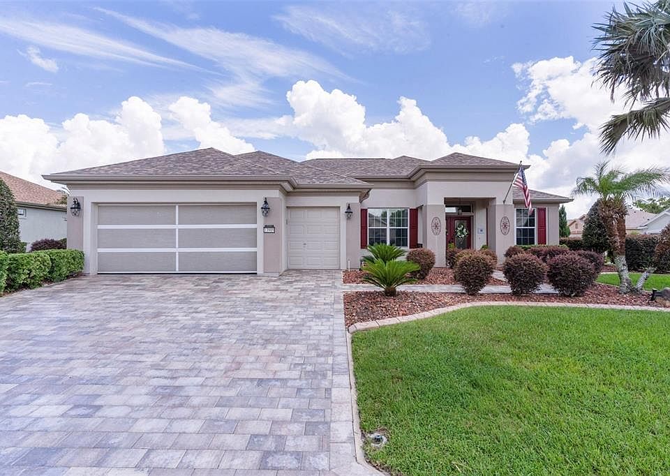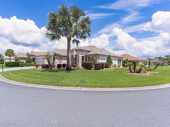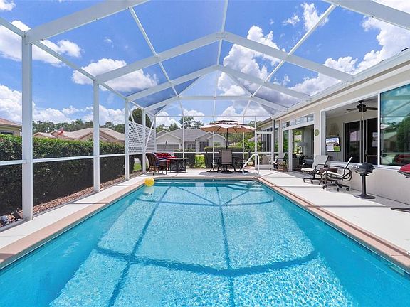 Welcome to the Florida lifestyle you’ve been searching for—a beautifully updated GRANVILLE model (1,870 sq ft) plus a 10 × 40 GLASS ENCLOSED, climate-controlled LANAI set on a manicured interior CORNER LOT with a private, SOLAR-HEATED SALT WATER POOL and a rare 2-car + GOLF CART GARAGE (570 sq ft). Every major system has been modernized, allowing you to start enjoying the sun-splashed backyard oasis. HIGHLIGHTS • 13 × 26 in-ground pool with variable-speed pump, 2016 solar heat, 2025 “cool-touch” deck finish, removable child-safety fence, and a 23 × 42 screened birdcage—perfect for year-round entertaining. • NEW roof, gutters, downspouts, attic fans & vents (2018; 35-yr architectural shingles). • NEW 2022 Trane HVAC extended to the lanai; programmable 50-gal water heater (2024). • Energy-efficient insulated windows & sliders (2017). • Porcelain wood-look tile throughout—NO CARPET anywhere (2017–2019). • Driveway and walkway upgraded to handsome INTERLOCKING BRICKS (2020). • Fresh interior paint (2022) and exterior paint (2019). • Chef’s kitchen: GRANITE counters, center island, pantry, natural-gas range (2017), microwave (2019), SELF CLOSING cabinet doors, tiled floor, and sunny breakfast nook. • Spacious primary suite with CROWN molding, walk-in closet, dual-sink bath, private water closet, and linen storage. • Split guest wing with large bedroom, full bath, and FLEXIBLE third room—ideal office/den/bonus space. • OVERSIZED garage with brand-new opener (2025), remote screen door, and epoxy-coated floor (2025), AND EXTRA STORAGE. • Lush 360-degree landscaping with concrete CURBING, irrigation WELL, and new low-voltage lighting (2024). WHY YOU’LL LOVE IT. Only 4 miles from the VILLAGES, welcome to this quiet, guard-GATED neighborhood. You’ll enjoy clubhouse amenities, golf-cart access to 12 PICKLEBALL and TENNIS courts, modern FITNESS CENTER with indoor pool, hot tubs, golf and much more. With many, many in thoughtful upgrades—including a new roof, HVAC, windows, flooring, and so much more—this home delivers low-maintenance peace of mind and resort-quality outdoor living. Ready to claim your slice of sunny Florida paradise in this 55+ DEL WEBB Spruce Creek Golf & Country Club? Schedule your private tour today!