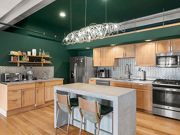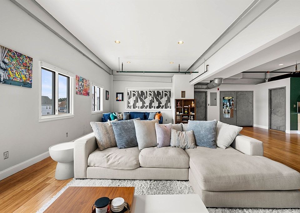 Unique offering of a penthouse level loft with easy access to grocery shopping, Hyde Park commuter rail, and all amenities within Cleary Square. Formally an artist loft building, this unassuming property is ideal for entertainers, creatives and collectors. Suite G stretches nearly 1,800 sqft and includes a grandiose entryway, oversized bedroom with double closets, ample storage throughout and spiral staircase access to exclusive use deck-area. Stamped architectural plans for a 400sqft roof deck included! All kitchen appliances, HVAC system/AC condenser and washer/dryer set were installed in 2022. The kitchen features two sinks and a custom concrete island with designer chandelier to complement the industrial nature of the home. Bamboo flooring, steel beams, and the impressive ceiling height throughout creates an environment unlike anything else you’ve experienced. The bathroom is equipped with a jetted tub and Suite G has exclusive access to a terrace overlooking the common foyer.