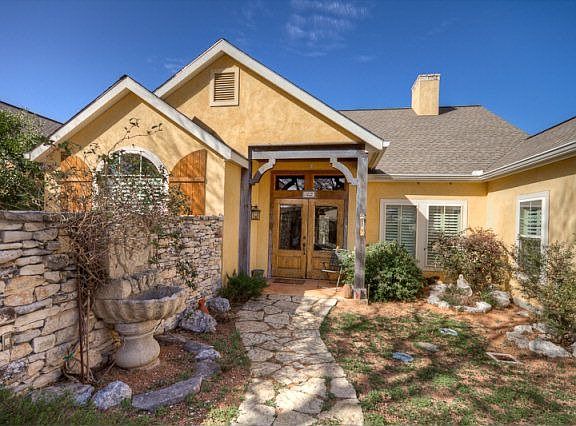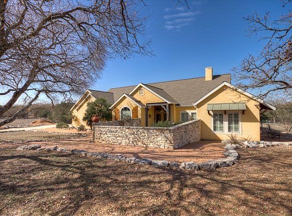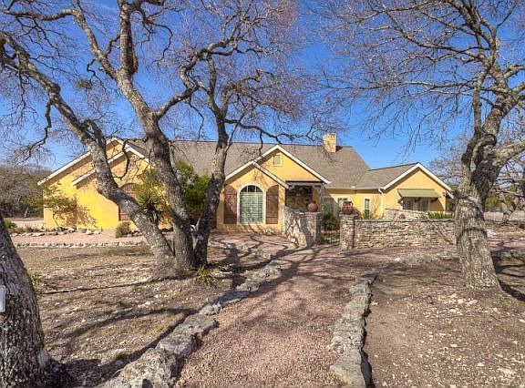 Enjoy living in this very private well appointed 3 BDRM 2BA Stucco home nestled in the live oaks and entered through a stone-walled courtyard which will be alive with bluebonnets in a few weeks. The Great room/w beamed ceiling features floor to ceiling bookcases on each side of the gas masonry fireplace and windows to view the fenced back yard. Formal dining room has pocket doors. Gourmet kitchen offers gas cook-top and separate veg sink with travertine counter-tops. Separate Breakfast area. Mudroom/butlers pantry. Scored and stained floors in main areas, carpet in bedrooms. Large Master bedroom offers fireplace and large master bath. Also, doors opening to covered back porch. Plantation shutters. 3.42 Acres. Gated Sub-Division.