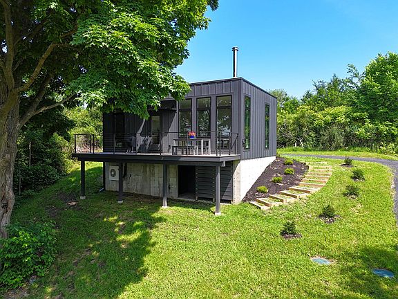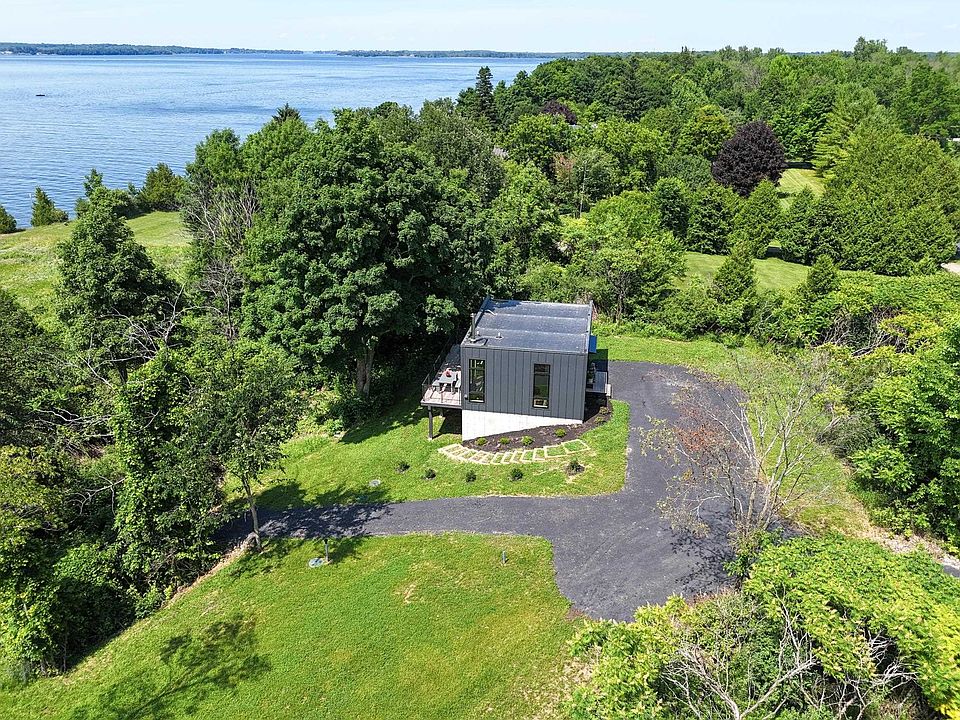 Experience unparalleled luxury and modern elegance in this custom-designed, year-round home completed by Hayward Design Build in 2024. Nestled on a sprawling 2.7-acre lot with 300 feet of direct west-facing frontage on Pelot’s Point, this property offers breathtaking views of the Broad Lake and the Adirondacks. The residence features an open-concept interior with 9-foot ceilings, birch hardwood floors, and floor-to-ceiling windows. The kitchen is equipped with Cabico white oak white wash cabinets, Silestone Iconic White quartz countertops, a Kohler farmhouse apron sink, and bar seating for four. The primary bedroom boasts an ensuite 3/4 bath with beveled glass shower doors and a pedestal sink, while the second bedroom includes built-in bunks. Additional amenities include a Danish made Morso wood-burning stove, an expansive elevated Ipe wood deck with metal-framed stainless-steel cable railing, a SaunaFin electric dry heat sauna, an outdoor shower, and a premium Dock Doctors stairway to the lakeshore with a 10x6 deck at the water’s edge. The property is also permitted for an additional 3-bedroom single-family home, featuring a shared septic leach field that has already been installed and infrastructure for future development, including a 400 amp meter panel and water supply connection. This home is the perfect blend of modern design and functionality, providing a luxurious lakeside living experience.