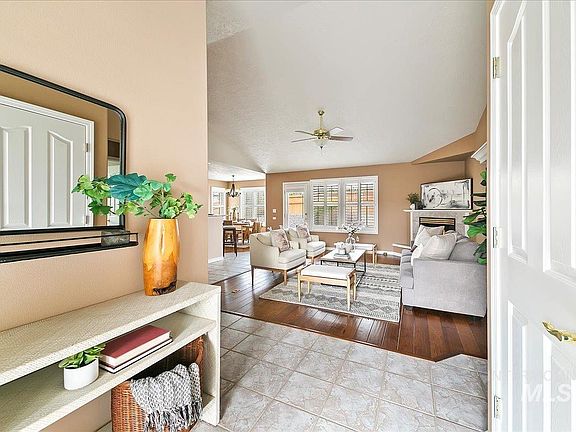 Fantastic location in coveted community of Bristol Heights & centrally located within minutes of downtown Eagle & the Village at Meridian. This single level, 3 bedroom, 2 bath home welcomes you with vaulted ceilings & sprawling hardwood floors into an open concept living, dining & kitchen. Enjoy the ease of working from home in your at home office with beautiful French doors & natural light. The master includes a walk-in closet, dual vanity and an oversized jetted tub with a private access to the back patio. Relax by the indoor fireplace or retreat to your private backyard sanctuary with luscious shrubbery & mature trees for ample privacy.
