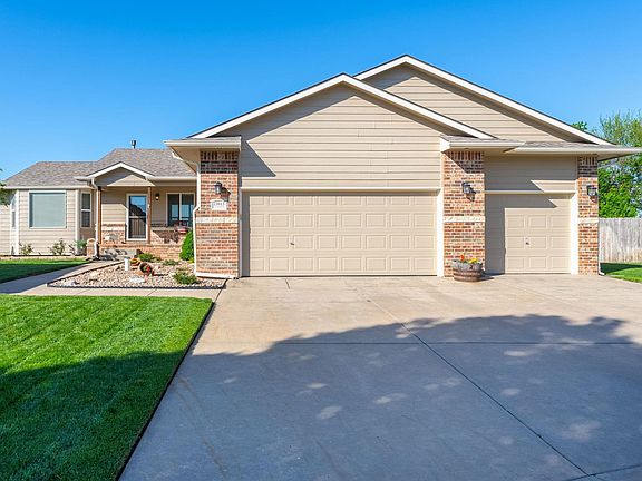 Prepare to be captivated by the pride of ownership evident in every corner of this stunning ranch-style home, nestled at the end of a quiet cul-de-sac on an expansive lot in the Maize School District. Boasting a 3-car garage, 4 bedrooms, and 3 bathrooms, this thoughtfully designed split floor plan residence exudes comfort and style at every turn. The master bedroom features wood laminate flooring. Step inside this ensuite to discover exquisite granite countertops, elegant flooring, and an abundance of natural light throughout the spacious Master retreat the space offers dual sinks, a generous walk-in closet, a luxurious soaker tub, a linen cabinet, and a separate shower for added convenience and indulgence. Bedrooms 2 and 3 feature charming wood laminate flooring and are conveniently situated on either side of a full bathroom adorned with granite countertops and tile flooring. The heart of the home, the kitchen, beckons with a welcoming bar opening to the living area and a separate dining space overlooking the expansive backyard oasis. Equipped with a pantry, gleaming granite countertops, stainless steel appliances, and a beautiful white backsplash, the kitchen is a chef's delight. Adjacent to the kitchen is a convenient laundry room for added functionality that is located between the kitchen and garage entrance. Descend into the spacious basement, where endless possibilities await. Whether it's hosting game nights, entertaining guests at the wet bar, or simply unwinding, this versatile space offers ample room for relaxation and enjoyment. Plus, with two storage spaces and a pre-installed radon mitigation system and HVAC replaced in 2022, so peace of mind is ensured. Outside, the backyard paradise awaits, complete with a sprawling fenced yard, a handy shed, and additional yard space beyond the fence, all exclusively part of this property. Thoughtfully placed gates provide easy access to the backyard, where a play set, treehouse, and sport court promise endless hours of outdoor fun and relaxation. Welcome home!