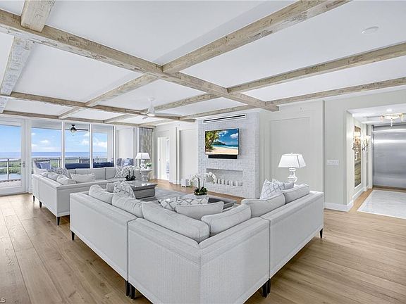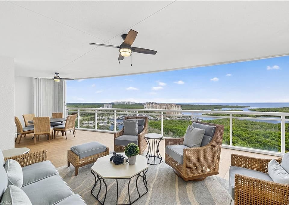 Welcome to Unit 1503 in Tower 100 in the award-winning and truly exceptional resort-style community of Kalea Bay. Ascend the elevator directly into your 15th floor sanctuary in almost 3300 square feet of casually elegant living space. This 4 Bedroom/4 Bathroom residence has been thoughtfully designed and furnished by premier local designer, Design West. Just bring your toothbrush, this unit comes Turnkey!! Open-concept living space features gorgeous wide-plank light oak flooring complemented by distressed wood coffered ceiling in the spacious living room with white brick decorative fireplace. Wall of glass opens out to a gorgeous outdoor terrace with panoramic views of Wiggins Pass and the Gulf. A true chef's eat-in kitchen replete with Sub-Zero/Wolf appliances, white shaker cabinetry, oversized quartz island flanked by waterfall edges and a convenient butler's pantry ideal foyer entertaining. Master Suite oasis with spacious bedroom with breathtaking western facing waterfront views, spa-like bathroom featuring oversized walk-in shower, separate vanities, separate water closet and enormous walk-in closet with custom built-ins. Split floor plan with 3 additional suites on the opposite end of the residence for utmost privacy. Kalea Bay is a 5-star, award winning community featuring 24 hour guard gated entry, a breathtaking 24th floor rooftop deck featuring gorgeous infinity pool, 4 built-in grills, open-air gym and club room with panoramic western views of the Gulf for the utmost in luxurious resort-style living. Kalea Bay Club is rich in amenities including multiple pools, wellness center, tennis and pickleball courts, 2 restaurants, 8 guest cottages and beach shuttle. Truly exceptional living at its finest.