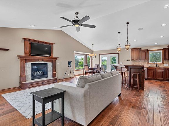 Welcome to this beautifully crafted 5-bedroom, 3-bath home featuring rich wood finishes and floors throughout. The open-concept kitchen with eating bar flows into the dining area, leading to a Timber Tech deck overlooking the water—perfect for relaxing or entertaining. Enjoy surround sound throughout the home, including in the spacious primary suite, which offers serene water views, an inviting bathroom with dual sinks, jetted tub, and a beautifully tiled shower. The finished basement is ideal for entertaining, complete with custom built-ins, included TV and speakers, wet bar, walk-out access to the hot tub, and even a hidden room! A rare find with exceptional design and comfort throughout! Located in the sought-after Goddard School District, this home offers convenient access to grocery stores, restaurants, swimming pools, scenic walking paths, and peaceful neighborhood ponds—a perfect blend of comfort, community, and convenience.