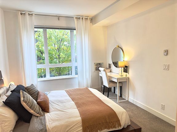 Full-size stainless steel appliancesUnder-cabinet lightingOversized bedroomHis and her closetsDual-access bathroomWest-facing balconyIn-suite laundry