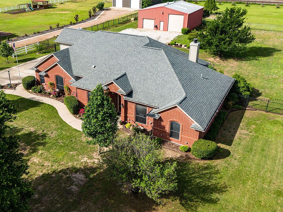 COUNTRY LIVING AT ITS BEST * Custom-built home & DREAM WORKSHOP ON 1.3 ACRES * 4-5 bedroom, 3-bath with home office or bedroom flex space * Property features a 40x40 workshop—1600-square feet of outbuilding equipped with high and low voltage electricity, RV parking, and gray water septic for RV use * The main house boasts an open floor plan with a bonus room above the garage and an attic space ready for expansion * Enjoy beautiful hardwood floors, screened in back porch, reinforced slab, and a durable aerobic septic system * Ample parking and RV-friendly * This PRISTINE country home is built with tender loving care and exceptional attention to detail * Beautiful wrought iron fencing enhances the quality and excellence of the expansive property * Pet-friendly, including dog run with an indoor, outdoor facility for animals * Gardener's dream! Experience serene country living with easy access to shopping and DFW highways, located in the desirable Northwest School District in North FtW.