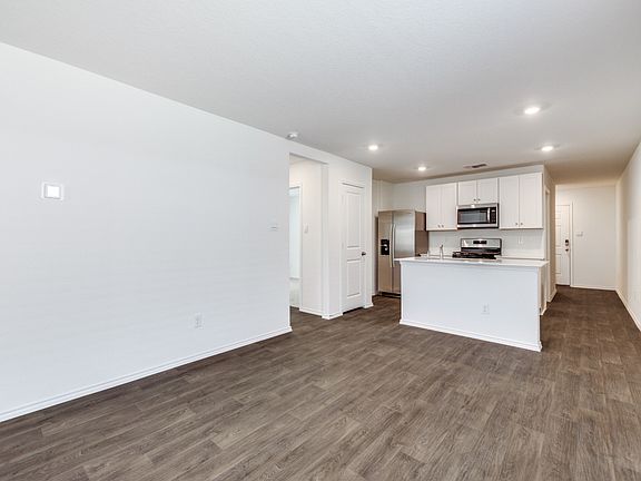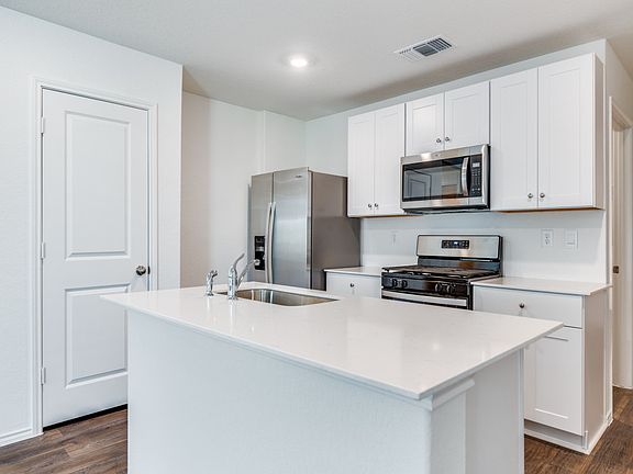 One-story home featured in Riverstone at West pointe in San Antonio, TX. Featuring 2 classic front exteriors, this 3 bed, 2 bath, 2-car garage. A front porch welcomes you into the home and opens to the gourmet kitchen which includes quartz counter tops, shaker style cabinets, stainless steel appliances and an open concept floor plan with the kitchen flowing seamlessly into the dining room and living room. * Refrigerator, *washer & dryer are included. Community offers, pools, gym, playground