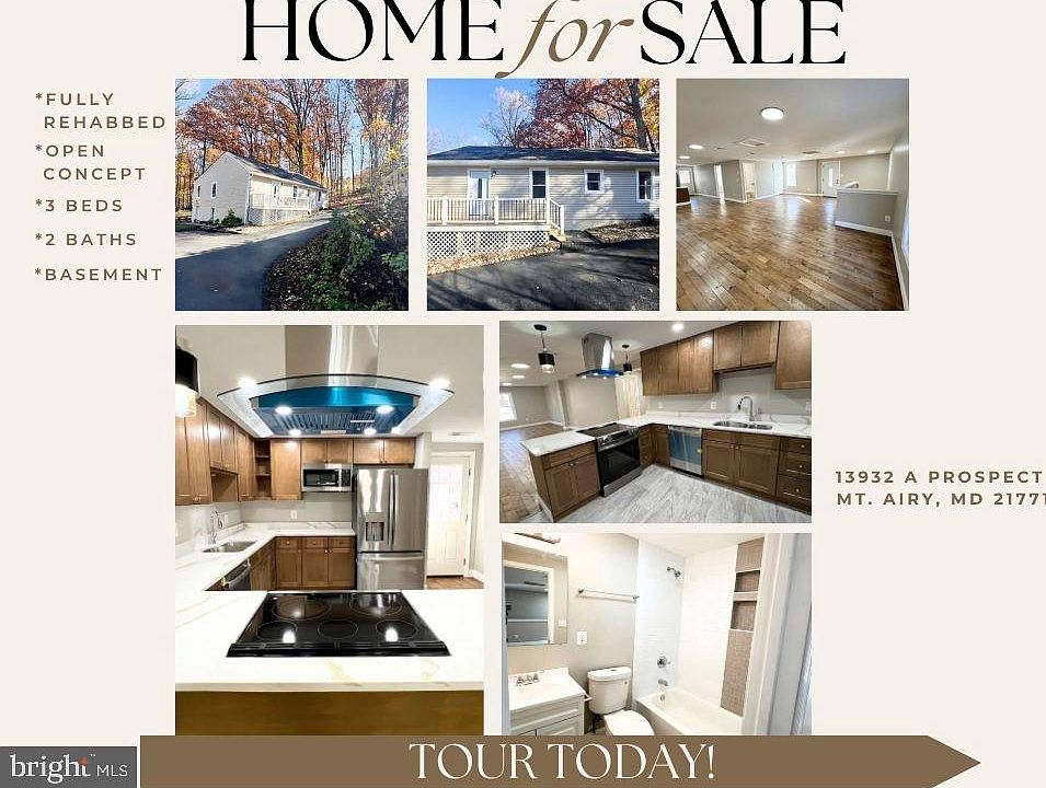 Welcome to this charming residence nestled in the heart of the HIGHLY DESRIABLE town of Mount Airy, MD. This 3 Bed, 2 Bath NEWLY REHABBED, OPEN CONCEPT home with a BASEMENT is on a SPACIOUS Wooded LOT (all most 1 Acre!) with a pretty setting in a PEACEFUL Neighborhood. Almost EVERYTHING is NEW! ... NEW STAINLESS STEEL Appliances! New HARDWOOD Floors! NEW ROOF! NEW PLUMBING! NEW ENERGY EFFICIENT HVAC! & PREMIUM FIXTURES! Whether you’re seeking your First Home, Downsizing for Less Steps or just want more SPACE, don’t miss the chance to make this Beauty your Next HOME. Schedule a TOUR TODAY!!! 13932 A Prospect Rd offers the perfect blend of COMFORTABLE LIVING & CONVEINENT ACCESS to I-70, I-270, I-,695, MD-27 & US-29, perfect for commuting to Baltimore, DC, Germantown, Gaithersburg, Rockville or jobs in between! Minutes from the vibrant local retail scene — the Mount Airy Shopping Center is home to an excellent mix of stores & eateries, making day-to-day errands a breeze. Enjoy a variety of restaurants just around the corner, from cozy bistros like Concetta’s Main Street Bistro to lively taverns such as Twin Arch Tavern. You can even shop at the local Knill's Farm Market and SK Gifts for something special. The town of Mount Airy is steeped in character with historic architecture, community events, and scenic surroundings, such as the Mount Airy Museum of History, Linganore Wine Cellars, Black Ankle Vineyards, Watkins Park, Mount Airy Rail Trail and Gaver Farm. Nearest hospitals include Frederick Health Mt. Airy (2.8mi); Springfield Hospital Center (18.1mi) & Adventist HealthCare Germantown Emergency Center (18.1mi).