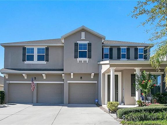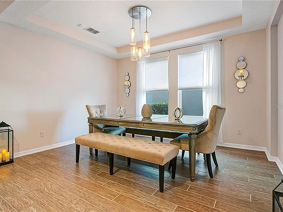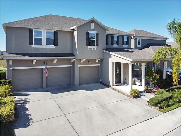 One or more photo(s) has been virtually staged. Nestled in the luxurious community of Orchard Hills, this 5 bedroom, 3 ½ bath home is ideal for the growing family with A-rated schools. Step inside to a neutral palate with warm ceramic wood plank tile flooring, formal dining room, and an open layout for the main living space. The family chef will be delighted with the well-equipped kitchen featuring warm wood shaker cabinets, subway tile, closet pantry, stainless steel appliances, granite counters, double ovens, and a large kitchen island for prepping. The spacious family room and dedicated breakfast area offer an abundance of natural light and remote control window treatment blinds on the upper windows. The downstairs master suite offers tranquility in the bedroom with blackout shades, new carpet and sunset views while the master bath highlights include his & her vanities with granite counters, garden tub, and glass walk-in shower. The upper floor offers a huge loft flex space, two liberal sized bedrooms sharing a jack and jill bathroom and 2 additional bedrooms share another full size bathroom. Brand new upgraded luxury carpet on the upper floor comes with a warranty. Never worry about the lawn again with yard maintenance, fertilization, and exterior pest control included in your HOA dues. Enjoy everything the community has to offer including food truck Thursdays, Bingo, Spring & Fall Festival, pet park, resort style zero entry pool, lounge area, fitness center, clubhouse, and playground. What are you waiting for? Schedule your private viewing today.