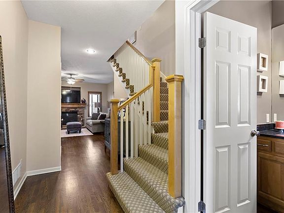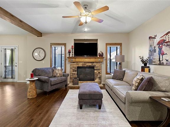 Maintenance provided living at its best in this stunning Tom French–designed Winston plan townhome, perfectly located in the highly sought-after Villages of Quail Park. This gorgeous neighborhood is known for its lush, manicured landscaping and inviting curb appeal, and this home is tucked onto a quiet cul-de-sac with a shared driveway, creating both privacy and charm. The ledge stone and stucco exterior welcome you to a covered front porch and storm door entry. Inside, gleaming hardwood floors set the tone, flowing past a stately half bath with granite vanity and into the spacious great room. Centered by a stone fireplace flanked by large windows, the great room creates a warm and inviting space that seamlessly connects to the breakfast area. From here, step through French doors to the screened-in deck with access to a flagstone patio and small yard—an ideal spot for morning coffee or evening relaxation. The kitchen offers a granite breakfast peninsula, stainless steel appliances, and two access points to the laundry room, one leading directly to from the kitchen and the other from the main entry hallway. Upstairs, a versatile loft/office area provides additional living space, perfect for working from home or relaxing with a book. The owner’s suite is a true retreat with plush carpet, ceiling fan, and French doors that open to a spa-like en suite bath featuring a jetted tub with tile surround, separate shower with ledge, double granite vanity, and large walk-in closet. Two additional bedrooms, each with ceiling fans, blinds, and soft carpet, share a hall bath with tile flooring, an extended granite vanity, and shower. The daylight, unfinished lower level is stubbed for a bath and offers excellent storage now with the opportunity to expand living space in the future. Blue Valley Schools add to the value of this thoughtfully designed home in a community where comfort, convenience, and timeless style come together.