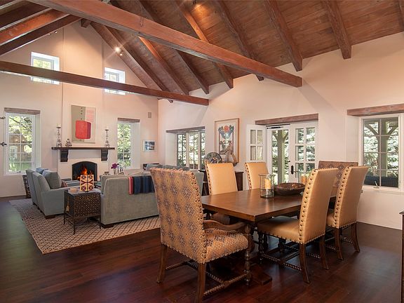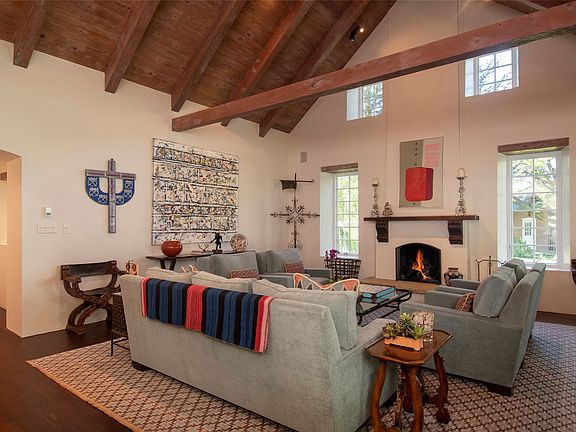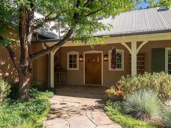 Set in the picturesque Tesuque area known for its tall shade trees, and rippling river and acequias, this splendid property with a 3432 sq ft main house and 3014 sq ft guest house sits on 3 parcels of land totaling 2.66 acres. Near the river and the Acequia Madre both homes are traditional Northern New Mexico style, with pitched metal roofs, and big divided windows and doors. Inside, pitched wooden beam and plank high ceilings create tall, open, airy rooms, while wood floors mimic the warmth of the ceilings. The 3 bedroom, 3 full bath main house has a great room with kiva fireplace, wet bar with wine cooler, and opens to a long portal, perfect for entertaining. The spacious kitchen has top appliances, great storage, and is wonderfully open to a gathering room with fireplace and breakfast nook. The main bedroom has the same pitched ceilings as the common areas, kiva fireplace and dual walk-in closets. A gallery hall leads to the other 2 bedrooms. Across the lush grounds dotted with gardens and trees, and down a walkway is the 3 bedroom, 3 bath guest house. The living room opens onto a courtyard and has a kiva fireplace and portal. The user-friendly kitchen has a large island with sink, great appliances and a breakfast nook, with the dining room opening onto a lovely portal. The courtyard separates the main suite from the guest bedrooms. This gated compound is minutes to downtown Santa Fe and backs up to Santa Fe National Forest giving it a secluded, away-from-it all feeling.