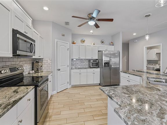 Inside, the open-concept floor plan is filled with natural light and features sleek light gray wood-look tile flooring throughout—no carpet for easy, breezy island living. The kitchen shines with crisp white cabinetry, granite countertops, and stainless steel appliances—perfect for cooking and entertaining. For added convenience, all major appliances—including the refrigerator, washer, and dryer—will convey with the sale.