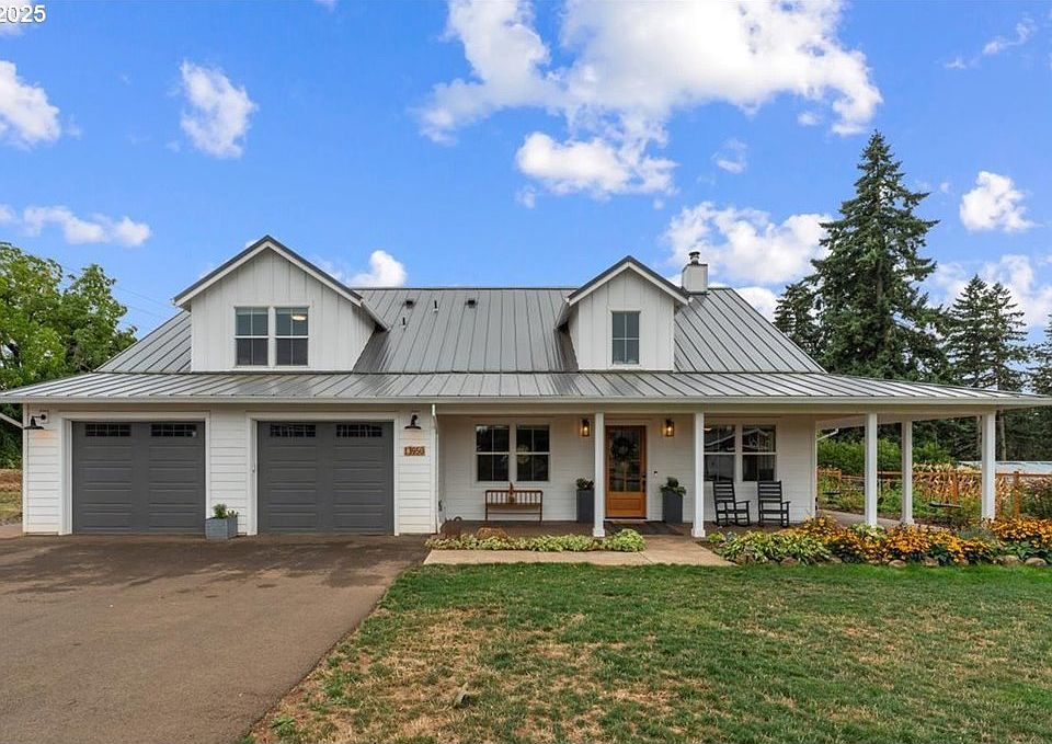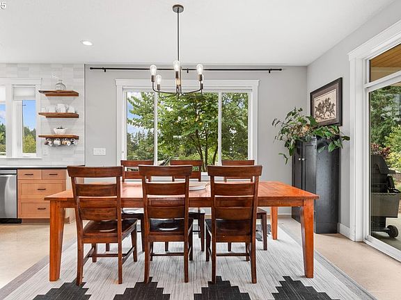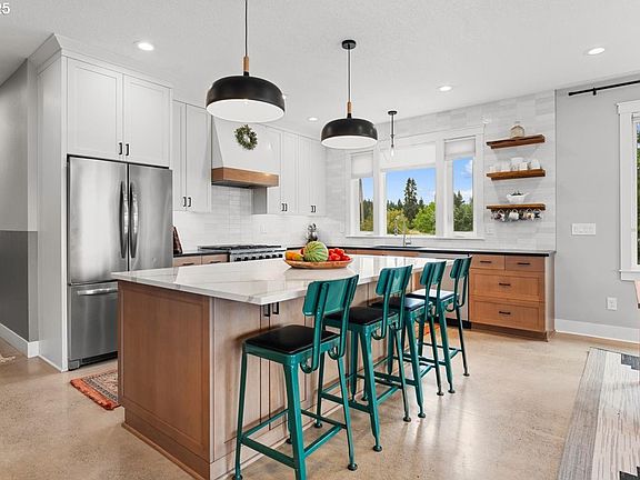 Located in a friendly, peaceful neighborhood, this stunning home was built just 6 years ago with the utmost attention to functionality & style. You'll fall in love the moment you step in the entry with its 17' vaulted & wood beamed ceiling, shiplap siding, dramatic pendant globe lighting & polished and aggregate cement floors. With 4 bedrooms including primary on the main + big bonus + office + finished storage room & 3 full baths, there is room for everyone! Thoughtful designer touches are everywhere, from the custom interior paint, to top-of-the-line fixtures & hardware, to the distinctive lighting. The primary suite includes a spa-like bathroom & French doors that open to a private covered patio. The Chef's kitchen is stunning! Custom cabinetry w/built-in features, roomy soft close drawers, cabinets that reach the ceiling, quartz countertops, 4-seat island, 6 burner Kucht gas range, well-sized pantry, built-in counter height desk & more! If cooking is your thing, you will be delighted! Look for the extra touches, like sliding barn doors, the map of the world wall paper, extra storage, tile, trim & smart features. The great room at the heart of this fabulous home is definitely the hangout area for all w/a cozy wood burning stove & tons of space! The outside yard & gardens only add to the fun! Wood rail fenced & set on .97 acres, just minutes from Oregon City, Canby, Molalla & Mulino, with a covered patio, fire pit area, play structure area, chicken coop, garden shed, fruit tree orchard + fenced-in ultimate garden, corn, blueberries, veggies & lots more (& room to add a big shop)! The garage is extra deep & includes a workshop & EV charger. Note the fully paid solar! After dinner on the patio, take in amazing sunsets over the coastal range from your porch covered w/pine tongue & groove mastery. Life is good in Mulino, w/easy access to restaurants, shopping, medical facilities, CCC, Hwy 213 & fresh air! This dreamy home is a special one! Come & see for yourself!