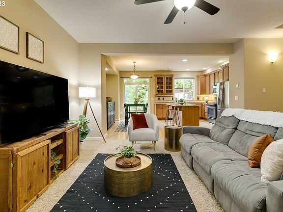 Step into the great outdoors and embrace the beauty of a scenic walking trail, a nearby dog park, and the convenience of Clackamas Community College nearby. Inside, the open floor plan living space beckons with a cozy corner fireplace, and a modern kitchen, complete with island seating and stainless steel appliances. The primary bedroom offers ample space with its walk-in closet, while the primary bathroom's dual sinks add a touch of convenience. Notable features include an ADA-friendly bathroom on the main level, a backyard bordering a private wooded area, and recently installed dishwasher and disposal.Additionally, the attached one-car garage, equipped with storage shelving, provides added convenience. Ensuring year-round comfort, a newly added air conditioning system awaits you, and the serenity of a quiet, traffic-free street enhances your living experience. Investors will be thrilled to learn that there is NO rental cap, making this property a fantastic investment opportunity, an ideal starter home, or an attractive rental property. Don't miss out on securing your own slice of paradise!