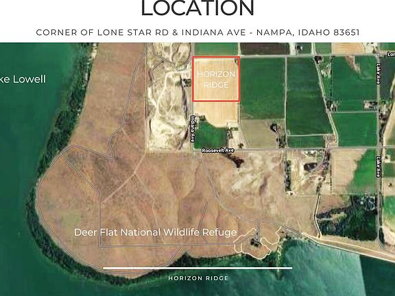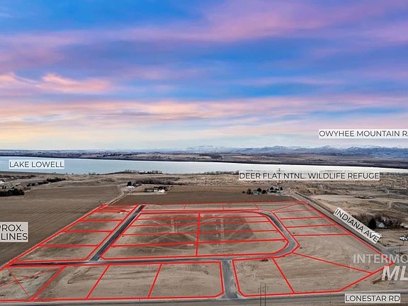 Horizon Ridge is your rare chance to build a custom dream home & shop on over 1 acre of 360 degree view lots on the North East side of Lake Lowell! Envision your future life on your porch taking in the sunset views of the Owyhee & Boise Mountain Ranges, the Treasure Valley, Deer Flat Nature Refuge & Lake Lowell. This unique opportunity offers a private community well for domestic & irrigation uses, power, gas, & fiber optic internet provided to each lot. Only a standard septic system will need to be installed! Located on the corner of Indiana Ave & Lonestar Rd, highway access, shopping, wine country & schools are just moments away. Bring your own builder, design your forever home & start living the quintessential Idaho life you've been dreaming of! Call for more availability!