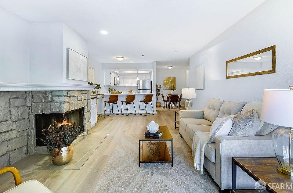 Welcome to this charming ground floor condo featuring 2 bedrooms, 2 baths, in unit washer dryer and 2 garage parking spaces. As you enter, you'll be greeted by an open-concept layout that seamlessly integrates the dining area and the updated kitchen. The kitchen boasts bar seatings, new stainless steel appliances, and quartz countertops that overlook the spacious and living room. The living room is a perfect spot for relaxation, complete with a cozy fireplace and a mini wet bar, while a sliding glass door reveals a long patio, perfect for outdoor lounging. Down the hall, you'll find a hall bath, a laundry closet, and built-in storage. The first bedroom features a mirrored closet, offering ample storage space. The primary bedroom is a true retreat, equipped with two closets, patio access, and an ensuite bathroom with a double vanity. This unit includes a 2 garage parking space, a storage room and access to the community's Terrace Club, which offers a pool, gym, sauna, and recreation room. Situated right off El Camino Real, this home is ideally located near a variety of restaurants and shopping options. Commuting is a breeze with close proximity to SFO, Millbrae BART, and HWY 101 and 280. Experience the perfect blend of comfort, convenience, and community in this beautiful condo.