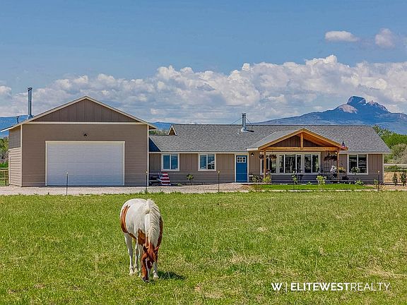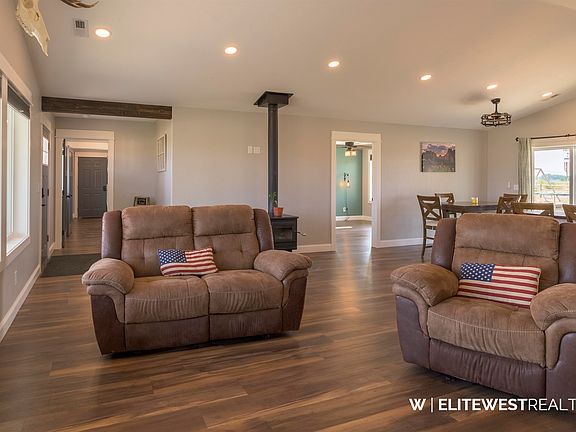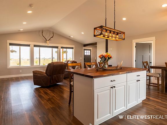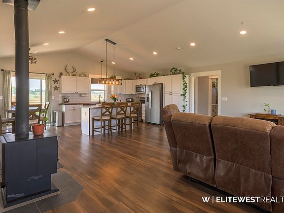 Experience the perfect blend of modern comfort and country charm in this nearly new single-level ranch-style home on 7.96 acres, with 6.7 acres irrigated. Located just minutes from Powell and 15 miles from Cody, this 1,692 sq ft, 3-bedroom, 2-bath home is thoughtfully designed for both everyday living and outdoor lifestyle. The open-concept great room features a stylish kitchen with butcher block countertops, tile backsplash, slate appliances, gas range, and a center island with bar seating. A split-bedroom layout provides added privacy, with a spacious primary suite offering patio access, a tiled walk-in shower with dual shower heads, dual granite vanities, and a large walk-in closet. A dedicated laundry room includes a flexible space for an office or craft room. The attached 1,200 sq ft garage/shop offers a 10' overhead door, gas setup for heat, and full RV hookup. Enjoy wide-open views from the covered back patio with new landscaping. The property is fully equipped for livestock or hobby farming, including a powered chicken coop and goat pen, a 24' x 40' barn with an enclosed 12' x 40' section, a fenced irrigated pasture with grass mix, and a 140' x 150' riding arena. Turnkey, versatile, and beautifully maintained. This is country living with modern convenience.