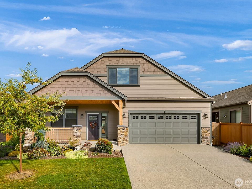 Welcome to Woods Point, a premier gated 55+ community designed for comfort and connection! Enjoy carefree living with HOA-maintained lawns in this beautifully crafted Landed Gentry Garden floor plan. Offering 2,372 sq. ft., this home includes 3 bedrooms + study, 2.5 baths, a spacious great room upstairs, and a 2-car garage. The main-level primary suite adds convenience, while the open concept design seamlessly connects the kitchen, dining, and living areas. Upgrades include quartz counters, LVP flooring, a cozy fireplace, and a covered front porch overlooking a fully landscaped and irrigated yard. Residents at Woods Point enjoy exclusive access to a private community center, a central park, and pickleball court.