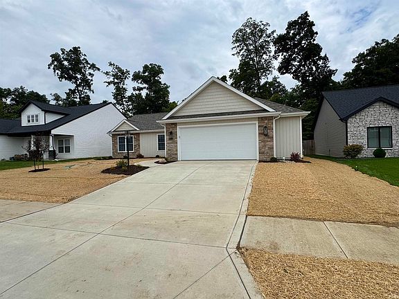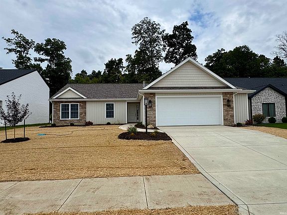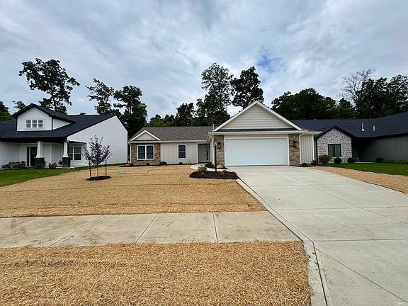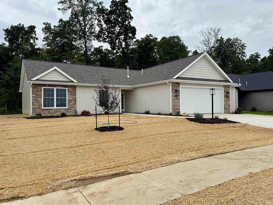 Recently completed new construction ranch by Carriage Place Homes, blending modern efficiency with timeless charm! This three-bedroom, two-bathroom home features a vaulted ceiling, corner stone fireplace, and open concept living. The floor plan seamlessly connects the living, dining, and kitchen areas — perfect for gatherings or quiet evenings at home. The Kitchen features white cabinets w/ soft close doors & drawers, large island, stone countertops & walk-in pantry. The primary bedroom features an en-suite with a walk-in closet and double sink vanity. Two additional bedrooms share a hall bath and a separate laundry room finish out this floor plan. Located on a private, tree-lined lot.