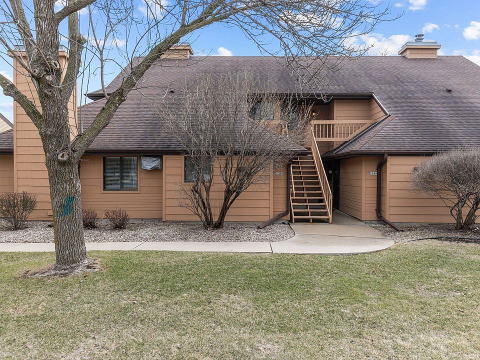 Fantastic Opportunity to Own Your Own Home! Don't miss this beautifully updated second-story 1-bedroom, 1-bath condo—a surprisingly spacious retreat! Featuring vaulted ceilings throughout, this home feels open and airy. The eat-in kitchen offers plenty of storage, while the large, light-filled living room boasts a charming wood-burning fireplace for cozy nights in. The primary suite is a standout, showcasing a stylish shiplap accent wall, walk-in closet, and direct access to the en-suite via a convenient pocket door. Step outside to your private balcony, perfect for morning coffee or unwinding in the evening. Plus, enjoy the convenience of in-unit laundry! Say goodbye to yard work—no shovels or lawnmowers needed here! Experience effortless condo living in a fantastic location!