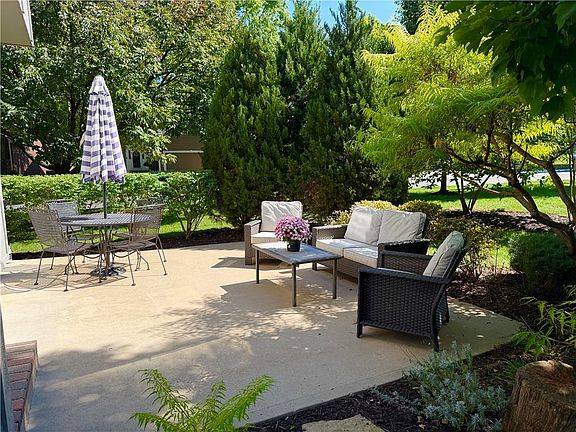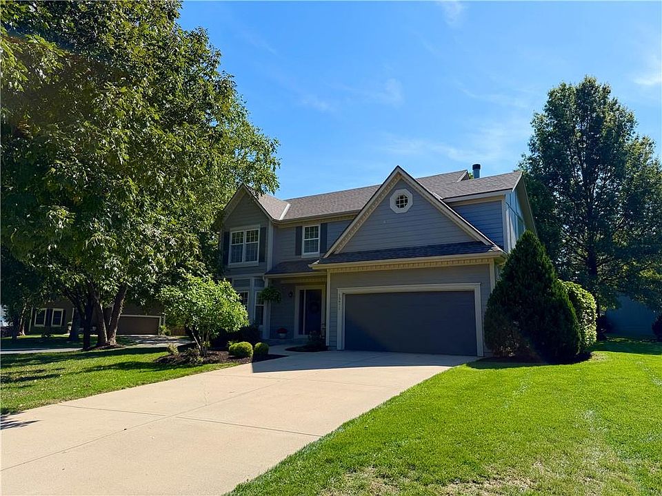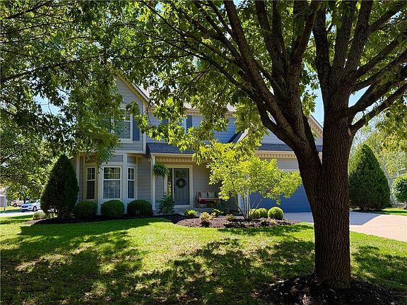 This is a gem you don’t want to miss! A beautifully maintained 2-story home tucked away on one of the best lots in Parkwood Hills. Perfectly situated on a large corner cul-de-sac lot, this property offers the perfect blend of privacy, curb appeal, and location in the highly sought-after Blue Valley School District. The exterior is picture-perfect with professional landscaping and mature trees surrounding the home. Step out back to the spacious private patio and enjoy the lush backyard, ideal for entertaining or unwinding in your own retreat. Inside, the inviting great room features custom built-ins framing a cozy wood-burning fireplace—perfect for gatherings or quiet evenings. The eat-in kitchen boasts white cabinetry, updated stainless steel appliances, hardwood floors, a pantry, a built-in desk, and a charming corner sink with views of the lovely yard. The dining room sits at the front of the home with a beautiful bay window and a perfect spot for your hutch (could be used as an office as well). Wood stairs lead to the finished lower level, offering a versatile family room and flex space that could serve as a home office, gym, or entertainment area. Lower-level couch is included in the sale. Upstairs, the primary suite is a true escape with vaulted ceilings, a huge walk-in closet, double vanity, large corner tub, and separate shower. Three additional bedrooms are generously sized with large closets and neutral finishes. The updated secondary bath shines with new tile, vanity, quartz countertop, and fixtures. The second-floor laundry room includes the washer and dryer in the sale. This home blends timeless character with modern updates and an unbeatable location—close to schools, parks, golf, shopping, dining, grocery, and easy highway access. This one is ready to welcome you home!