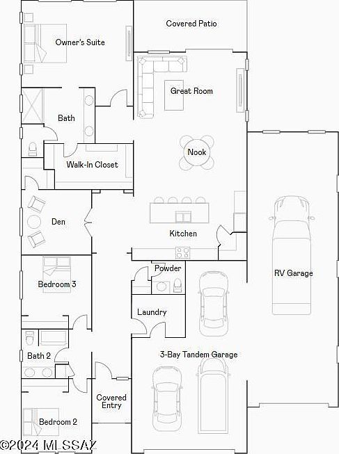 This new home design has space for the whole family and their vehicles. Off the foyer are two secondary bedrooms and a hall that leads to the den. The open concept living area brings together the kitchen, dining and Great Room, plus sliding glass doors open to the covered patio. Situated off the Great Room, the owner's suite boasts a spa-like bathroom with a large walk-in closet. The two-bay plus sport garage also includes RV storage, providing plenty of space for vehicles and toys. This home includes our Super Kitchen Package featuring upgraded appliances in the kitchen. As an added bonus, this home has the beautifully finished garage with epoxy flooring and stylish cabinet hardware in the main kitchen--adding the perfect finishing touches throughout!