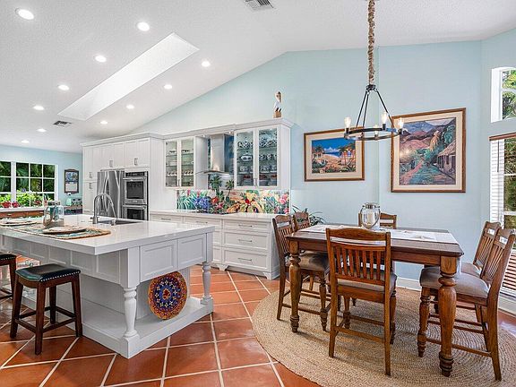 Beautiful and Unique 4 bed, 2 bath one story home lovingly cared for by the same family for over 30 yrs. Nestled among the mature trees, the house offers privacy in a park like setting. The roofed & screened patio has southern exposure and overlooks a lush fully fenced backyard with room for a pool. Bonus Metal roof, Lennox A/C 2024, long driveway and well irrigation system. Spectacular kitchen is gem of the house! It has a skylight, white quartz countertops, upgraded white wood, lighted cabinetry with glass doors and under cabinet lighting, an abundance of storage and pull out drawers, a large island with built in storage, a Kitchenaid cook top range, built in double ovens and dishwasher, a cafe door refrigerator, and a stainless steel sink. The tile back splash is a work of art......con by a renowned artist. A hurricane glass sliding door opens to the patio, making it easy to entertain. A separate laundry room with newer washer and dryer. The open floor plan has 16" Saltillo tile which is installed on the diagonal throughout the house. Cathedral ceilings and large windows provide an abundance of natural light. The dining room has floor-to-ceiling windows, the living room has a "disappearing" sliding glass door opening to the patio. The master bedroom has plantation bi-fold shutters opening to the patio. The second bedroom has a customized "California closet", and the third bedroom has cross-ventilation windows. French doors open to a fourth bedroom, office, or den, which is separate from the other 3 bedrooms. The two bathrooms have beautiful wood cabinetry and glass-enclosed showers. The master bath has a Roman tub beneath a large picture window, and a walk-in customized "California closet". No HOA in this family and animal-friendly community.