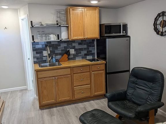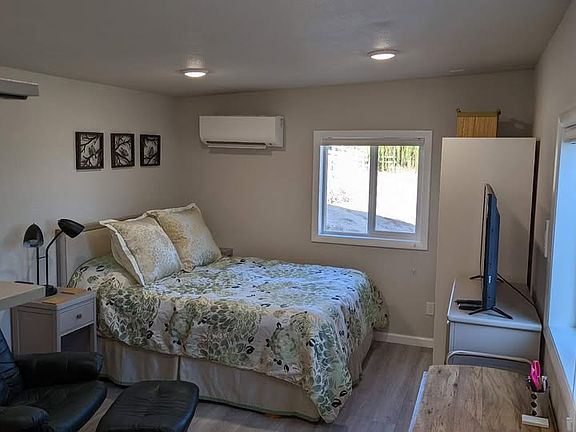 This detached studio apartment has a full bathroom, with a kitchen that includes fridge, stovetop, microwave, air fryer and convection oven. Features a queen Casper mattress with closet and dresser, and 10ft Carport 50 yards away. Has patio chairs and a shared firepit, perfect for a relaxing, quiet night. Located 3 minutes from the freeway, but is tucked away off the highway, so location is quiet . All utilities included.