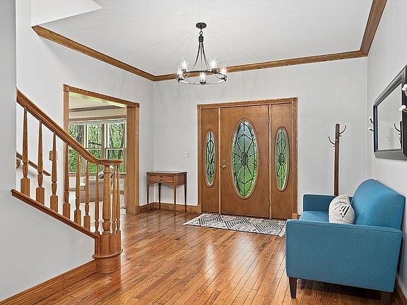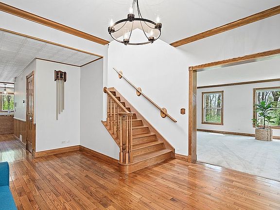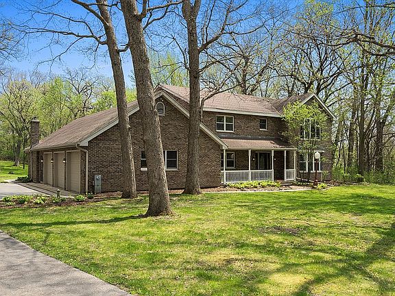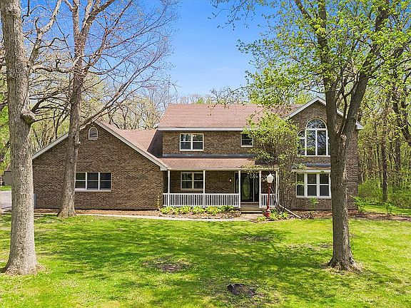 Own a secluded forest estate! A custom 5 bedroom/4 bath brick home on 5 wooded acres filled with mature oaks, plum grove, grapevines and apple trees. Adjacent to Burlington Prairie Preserve for hiking or horse riding. 2300 sqft pole barn with attached chicken coop is perfect for RV or boat storage, shop, or a horse barn. Family room with soaring vaulted wood plank ceilings and a wood-burning stove which can heat the entire main level. Kitchen with large butlers pantry, maximum storage, granite counters, brand new Kitchenaid appliances and amazing sunrises. Dining room currently houses a 12 ft long table and piano. Great for entertaining large groups. Beautiful owner's suite with large windows, tons of natural light, large walk-in closet and a luxurious master bath with soaker tub and built-in Bluetooth. Generous size bedrooms including main floor bedroom with walk-in closet. Extra-wide stairs and hallways. Flex room on the 2nd level serves as an office, game room, 6th bedroom or 2nd level sitting room. Large Laundry room on the main level with laundry shoot and new large capacity washer and dryer. Beautiful finished basement with waterproof engineered flooring, full bath, full kitchen/mother-in-law suite with separate entrance through garage. Great for rental income. On-demand tankless water heater. 400 AMP electrical service with transfer panel wired for generator. Dual furnaces for energy-saving and Nest thermostats on both levels. 3 car garage with individual doors, wide spaces and raised area for workshop. Large deck to enjoy the serene and secluded setting. Excellent schools in D301. Don’t miss this opportunity to enjoy this stunning estate!