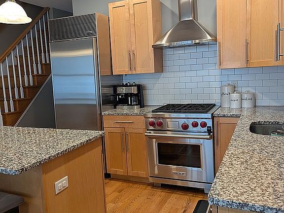 - Eat-in kitchen with granite counters, Wolf gas range, and Subzero refrigerator