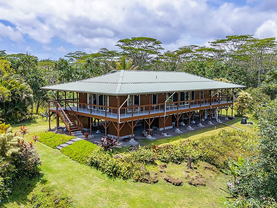 Amazing 6.888 acres of tropical property with a one of a kind, beautifully crafted, “Hawaiian” style custom cedar home. Located in the coastal community of Wa'a Wa'a, this off-grid home is nestled in a magical wonderland of lush green lawns, a variety of tropical plants, mature fruit trees plus a bonus greenhouse garden of edible plants.