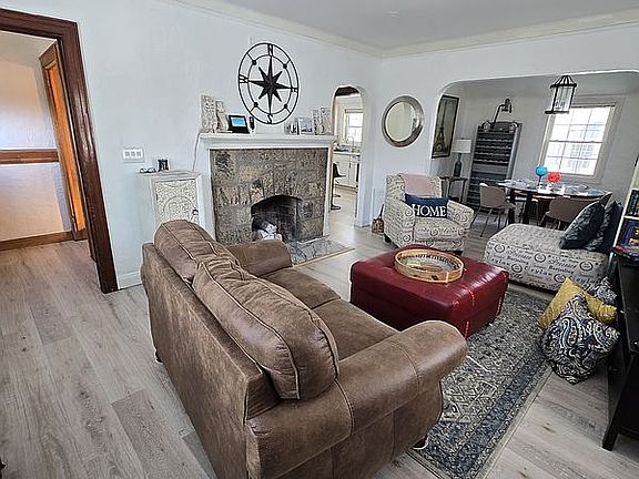 The living room boasts a cozy working stone fireplace, while the updated kitchen is equipped with premium Samsung appliances, including an electric stove with convection oven, over-the-range convection microwave, dishwasher, and a sleek 4-Door Refrigerator. The adjoining dining area is perfect for family gatherings.