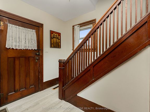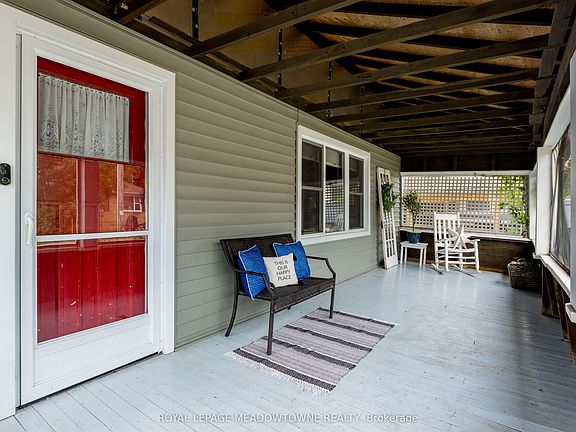 Charming 1.5-Storey Home on a Private 50 x 132 Ft Lot in Central Georgetown. Set on a quiet, tree-lined street, this inviting 3-bedroom, 2-bath home offers character, comfort, and convenience. A screened front porch leads to a practical layout featuring an updated kitchen (2012) with granite counters and direct side entry from the driveway. The dining room opens to a deck and beautifully treed backyard -- your own private oasis. Recent 2025 updates include fresh paint throughout, new broadloom, and luxury vinyl plank flooring in the hallway, kitchen, and dining room. An oversized shed provides excellent storage or workshop potential, and the driveway accommodates up to three vehicles. Prime central location -- walk to the GO Station, downtown shops and restaurants, parks, trails, and the village of Glen Williams. Properties on this quiet street are rarely available -- don't miss this exceptional opportunity in a well-established neighbourhood. Updates: Interior paint ('25), Broadloom ('25), LVP flooring ('25), Exterior siding & Insulation - approx. 30k ('19), Kitchen ('12)