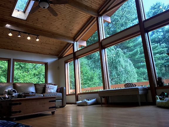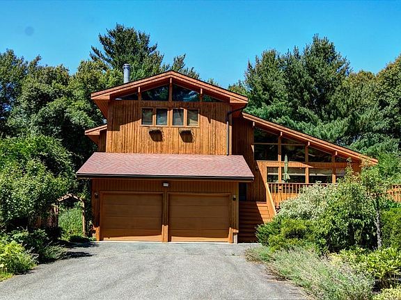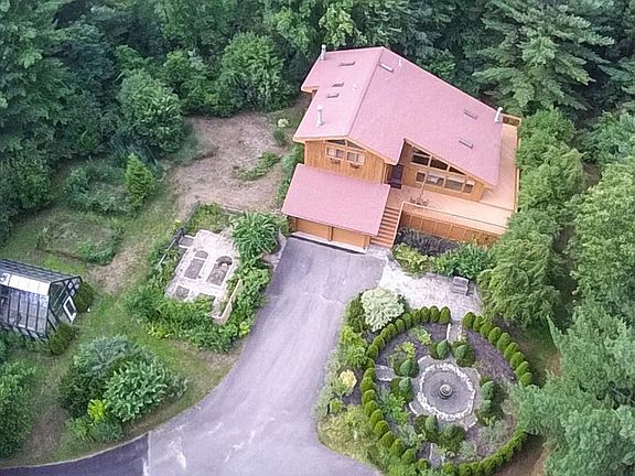 GARDENER & NATURE LOVER'S HAVEN ! This secluded estate is more than just a house. Delight in owning your own Florian Greenhouse and Stone Vegetable Gardens on a Private 5 Acre parcel of land. Live in a fantastic contemporary Post & Beam Lindal Cedar home, tucked away at the end of a cul-de-sac yet close to all the modern conveniences. Visualize yourself sitting on the raised wraparound decks overlooking a serene fountain, Laburum tunnel, and beautifully wooded grounds. Once inside you will love the soaring cathedral ceilings, sun drenched open floor plan, 2 large Sun Rooms, and 3 ceramic wood stoves. The first floor hosts the den, kitchen/living/dining area, a full bath, mudroom, laundry and storage. Upstairs, the light filled master features a lovely en suite bath with double sinks and two generously sized closets. High ceilings and tall windows provide stunning views of the tree tops, greenhouse, and grounds. Two additional bedrooms have their own full bath. Come see for yourself !
